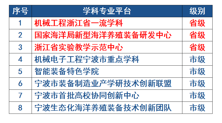 本专业所在学科已成为宁波市海洋机电技术、智能装备集成技术优先委托基地。实验室总面积5500平方米,设备资产达4000多万元,除了拥有机械工程实验室、机电装备可靠性实验室、机电测控实验室和工科实训中心等专业基础实验室外;还具有专业特色方向的智能机器人系统实验室、海洋水动力学实验室;同时开设的老员工创新设计开放实验室已成为机械设计竞赛、挑战杯等各种竞赛的培育基地。拥有ECA-H800水下机器人实验系统,波流复合水池、六自由度运动仿真平台、史陶比尔TX60视觉引导机器人系统、费斯托TP101气动综合实验系统等大型专业实验设备,具备实施本专业特色培养的软、硬条件。