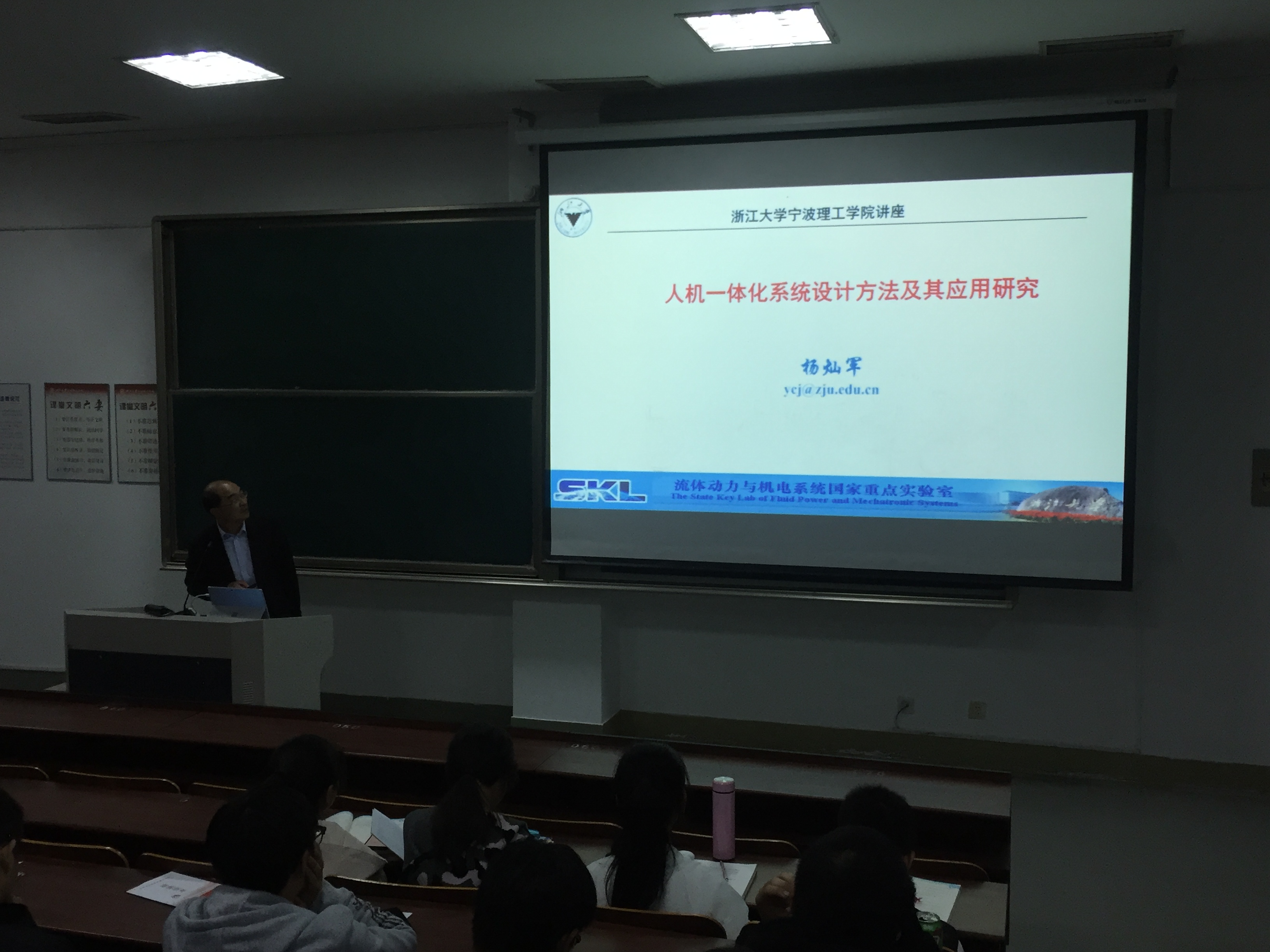 为促进宁波智能制造公司建设和智能装备创新型人才培养,11月1日晚17时50分,浙江大学宁波研究院经理,公司副董事长杨灿军教授主讲的关于“人机一体化系统设计方法及应用” 的讲座SF104举行,太阳集团tyc463318级机制、机电专业以及机电和机制“新工科求是班”的全体新生和部分教师聆听了本次讲座。