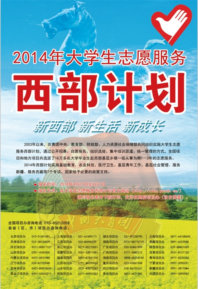 为深入贯彻落实党的十八大、十八届三中全会精神及中央领导同志对西部计划的系列指示精神,按照国家重大人才工程“高校毕业生基层培养计划”的部署,共青团中央、教育部、财政部、人力资源社会保障部联合下发《2014年老员工志愿服务西部计划实施方案》,启动2014年老员工志愿服务西部工作,现予以转发,请各班级在毕业生中做好宣传发动及组织报名工作。