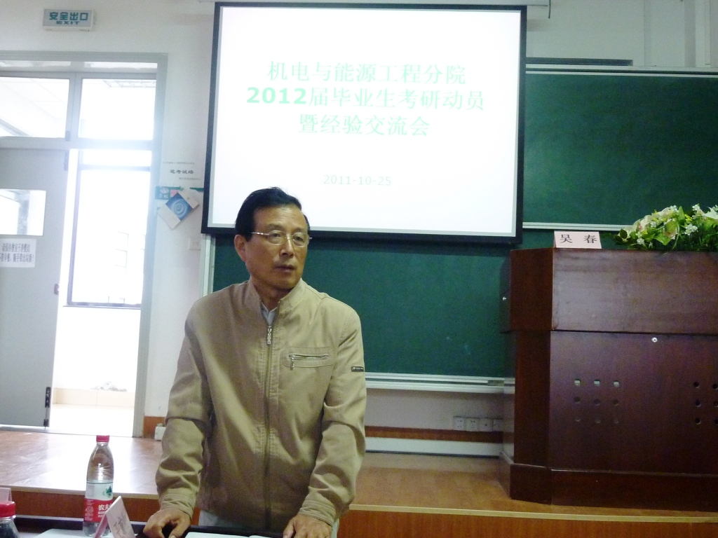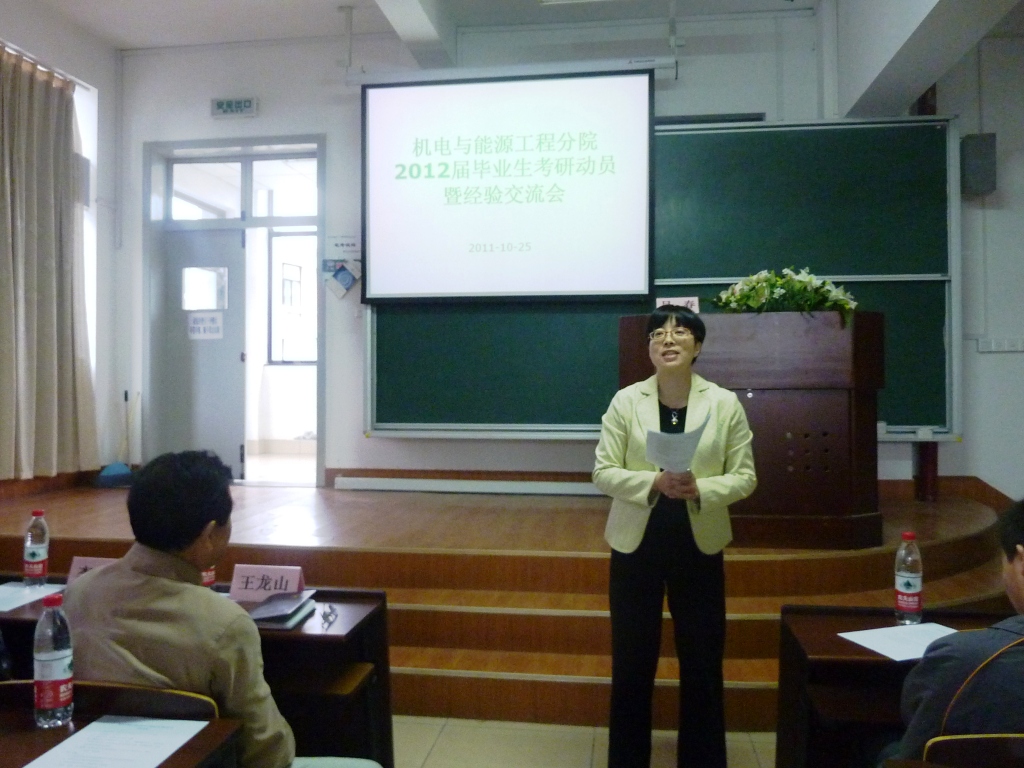 此次机电分院2012届毕业生考研动员暨经验交流会于10月25日下午4点15分在NC302召开。分院经理王龙山,党总支书记吴春,副经理李建新及就业领导小组全体成员、毕业班班导师、分院辅导员和正在备考2012年考研的62名同学参加了此次会议,会议由吴春书记主持。