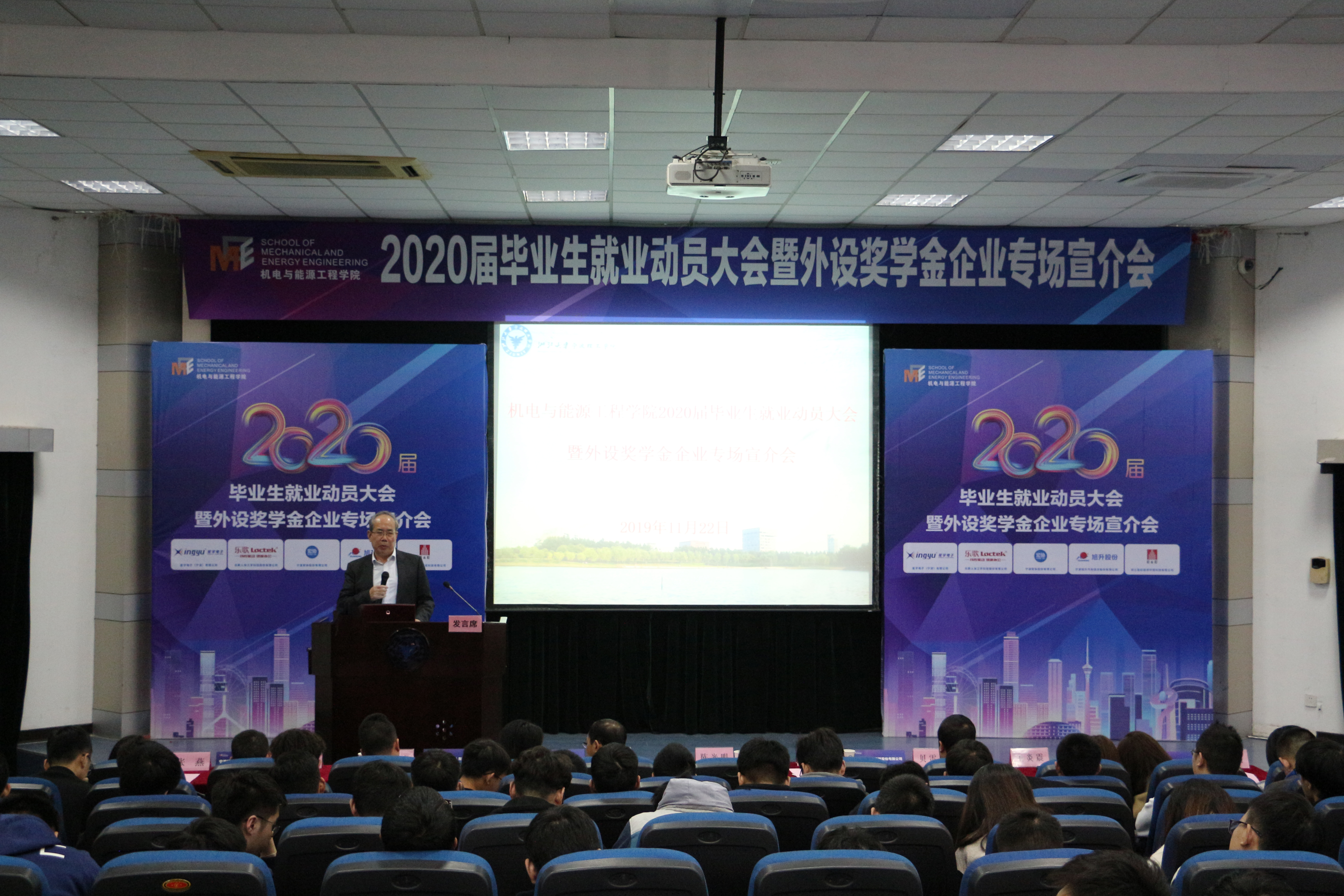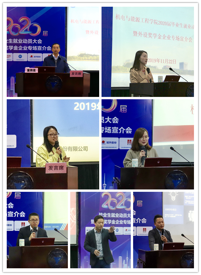 11月22日下午,太阳集团tyc4633在NF103教室举行2020届毕业生就业动员大会暨外设奖学金企业专场宣介会。公司外设奖学金企业,乐歌人体工学科技股份有限公司人事经理杨慧女士、精益生产总监贝雷贤先生,宁波宏协股份有限公司人力资源部经理虞盼攀女士,星宇电子(宁波)有限公司人事行政部总监江伟峰先生,宁波旭升汽车技术股份有限公司人力资源副经理蔡涛先生、招聘专员张燕女士,浙江宏纪能源环境科技有限公司总经理王炎震女士、项目负责人杜晶晶女士、人事专员蔡双璐女士等嘉宾莅临现场。太阳集团tyc4633经理陈光明教授,公司党委书记、副经理童微星老师,以及毕业班班导师和公司全体2020届毕业生参加会议。本次大会由公司党委副书记、纪委书记王晶老师主持。