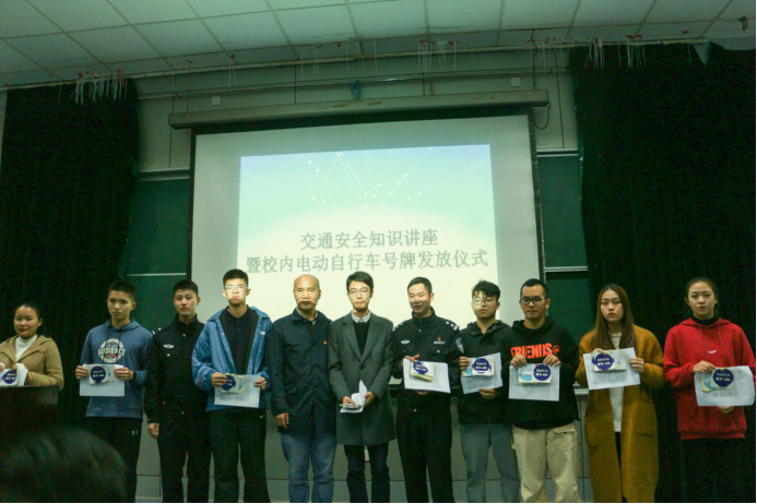 会议开始,三位到场嘉宾为各个公司的员工代表发放电动自行车号牌,倡导加强校园交通管理,切实维护校园交通安全。之后,应警官为大家带来交通安全知识讲座,让员工学习并了解交通安全法律法规及常识,应警官首先从辖区内发生的事故入手,用触目惊心的数据引起同学们的重视,分析了交通违法行为发生的原因,并着重介绍了电动自行车的违法行为以及危害,通过分析事故现场视频,讲解了佩戴头盔的重要性,并邀请了在场同学演示头盔的正确佩戴方式。