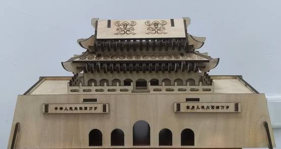 太阳集团tyc4633员工利用所学专业知识,借助软件进行设计制图,使用激光切割机来切割5mm木板制作零件,再进行配合拼装完成制作的天安门城楼模型,以此来向祖国献礼,用行动展现了出对祖国的赤诚之心。