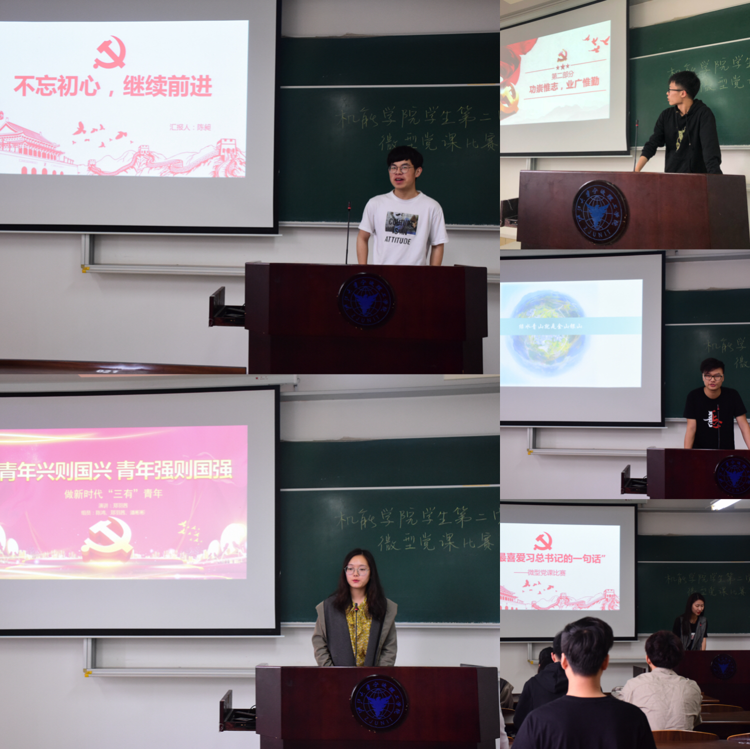 支部党员自由组队共分为五个小组,每个小组选派一名发言人上台做主题演讲。各个小组的同学经过精心准备,与大家分享了“不忘初心、继续前行”、“千难万难,只要重视就不难;大路小路,只有行动才是出路”、“绿水青山就是金山银山”、“青年兴则国兴,青年强则国强”、“积土而为山,积水而为海”等习近平总书记的经典语录,不仅有习总书记的解读,还有同学们自己的理解,每一句话都引起诸多共鸣,每一个同学都沉浸在习总书记的谆谆教诲中。最后,支部书记仇芳老师做总结点评,仇老师肯定了各个小组的精彩分享,与大家分享了自己最喜爱的习总书记的一句话“耳闻不如目见之,目见不如足践之”,鼓励各位党员知行合一,多学习多实践。