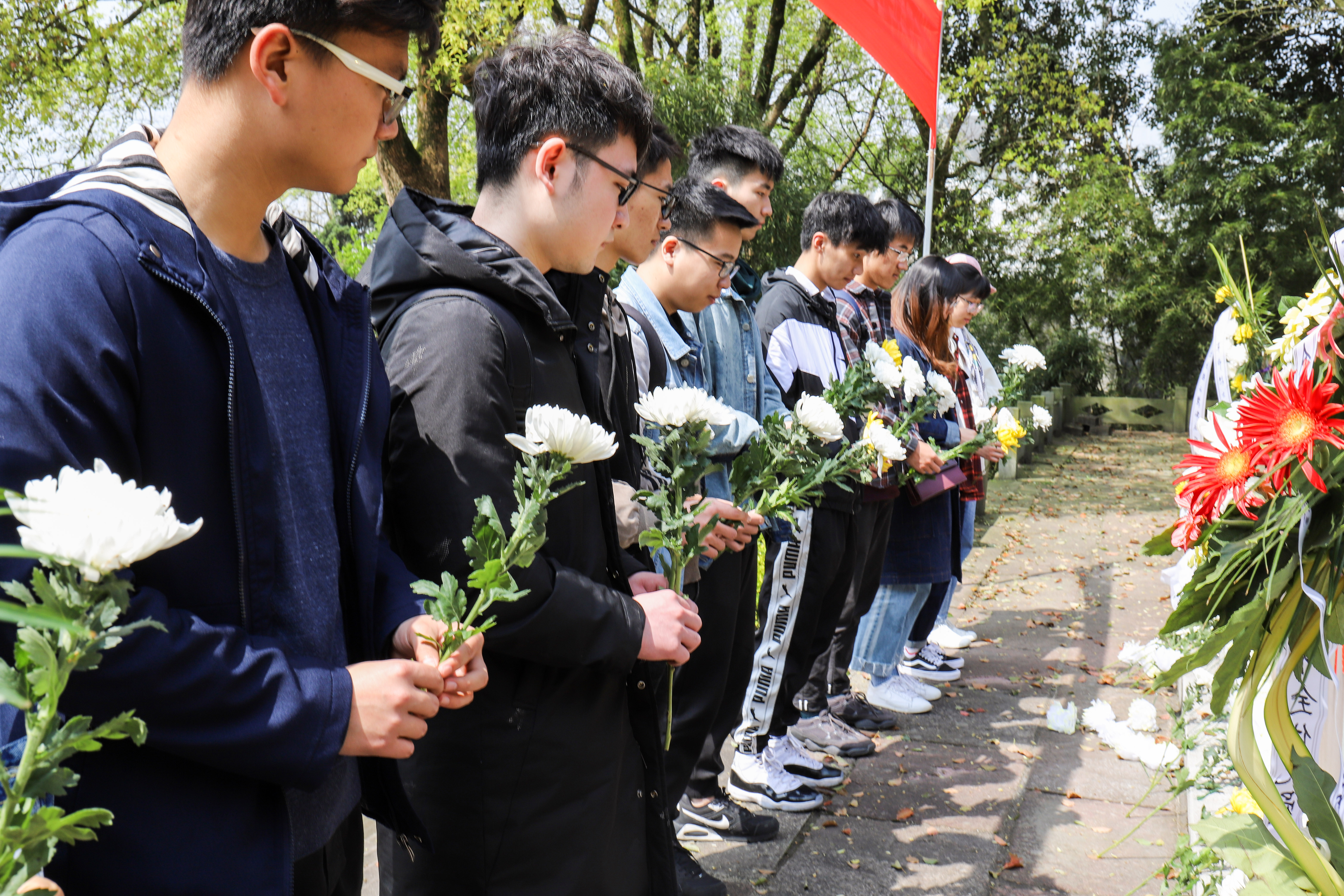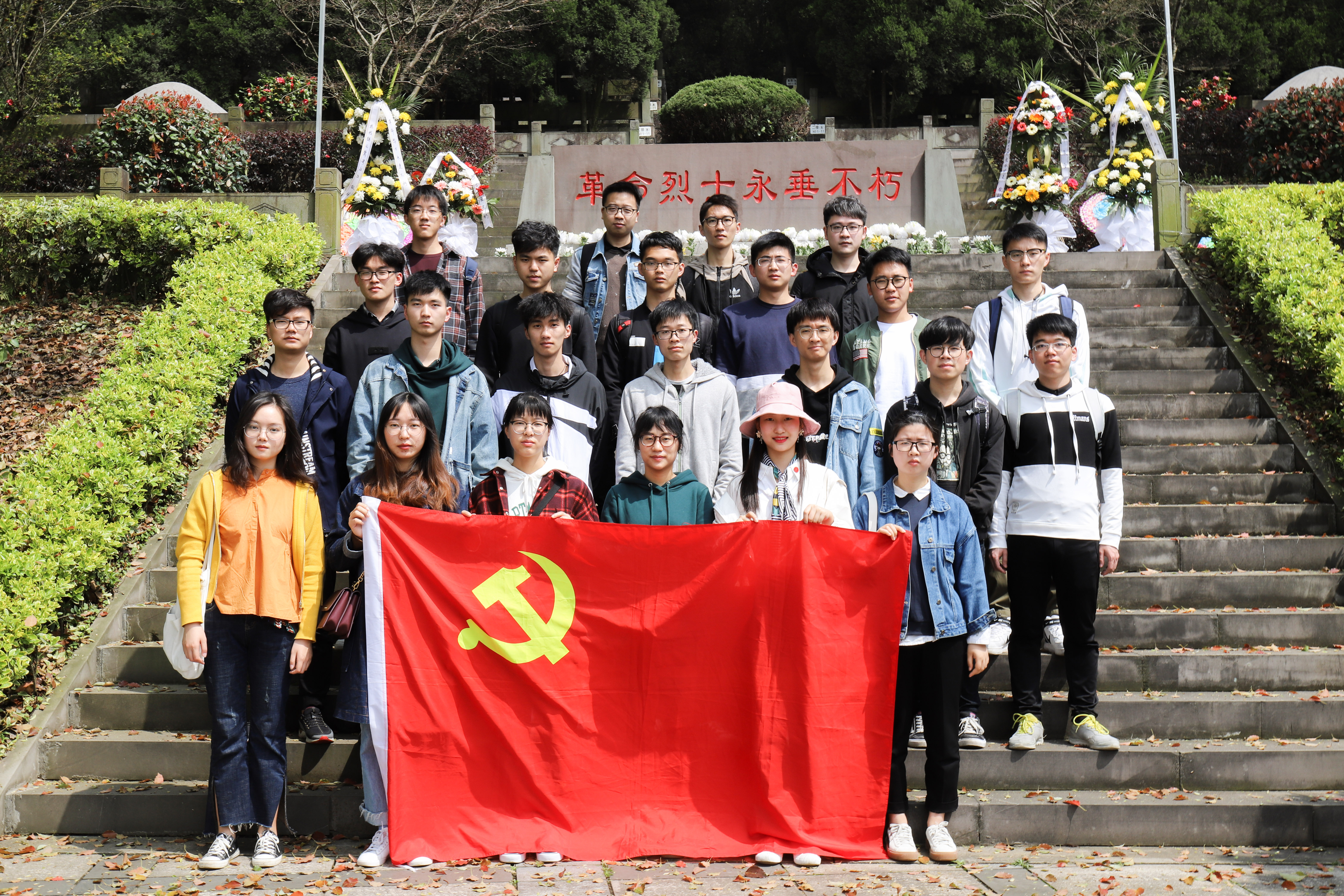各位党员怀着沉重的心情一阶阶走上陵园的阶梯,瞻仰着一块块墓碑,很多年仅二十余岁的烈士引起了同学们的阵阵唏嘘,那么多年轻的生命为了新中国奉献一生,他们都是一位位英雄、永垂不朽的烈士!在墓前默哀的我们,感谢烈士们为我们带来的美好生活,不断告诫自己要珍惜这来之不易的生活,要继承革命烈士的精神,热爱祖国,为祖国抛头颅,洒热血。接着我们来到纪念碑前,庄重地将手上的鲜花献给烈士们。革命先烈的一幕幕事迹浮现在眼前,那些名字被刻在纪念碑上的革命先烈的一生,是英雄的一生,光辉的一生,他们给我们留下了宝贵的精神财富。