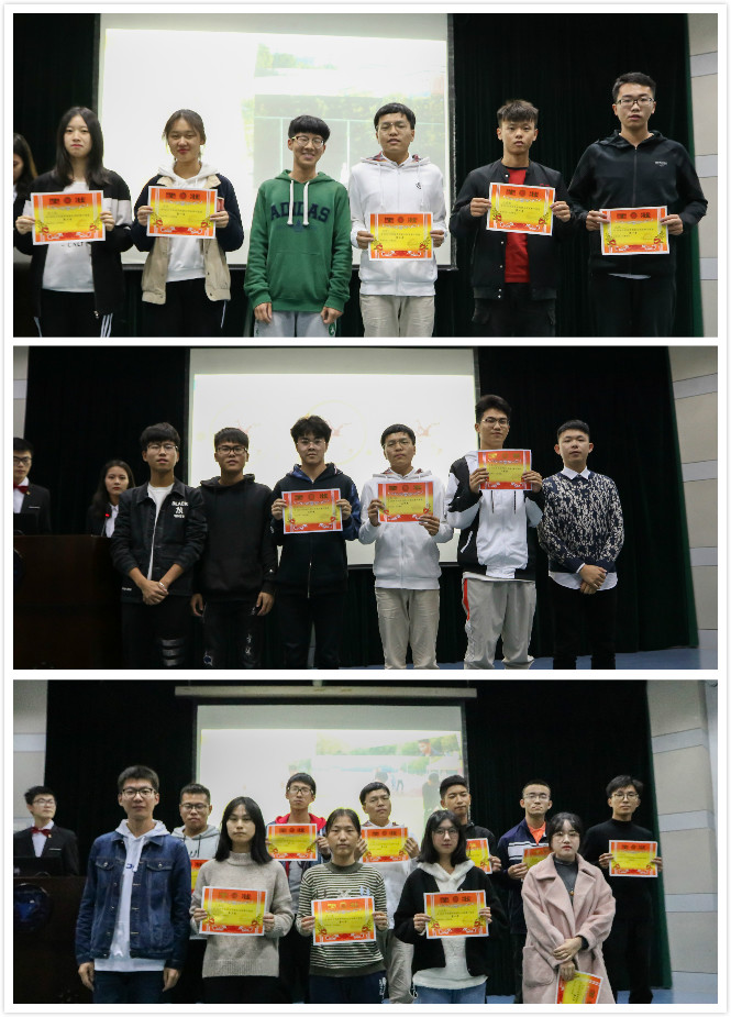 首先,社联主席何振杨先对排球、网球、木球和万米接力比赛中获奖的团体和个人进行了表彰,并为本次新生训练营总分前三的班级颁奖。期间还播放了万米接力比赛的精彩视屏,参赛者们的默契配合让同学们切身感受到了集体的凝聚力。随后,社联主席何振杨、社联副主席赵海鸣、督导部部长夏金泽分别上台发言,表示对此次新生训练营中参与工作部门的感谢,并以自己的亲身经历告诉同学们要珍惜老员工活点滴,享受大学时光。