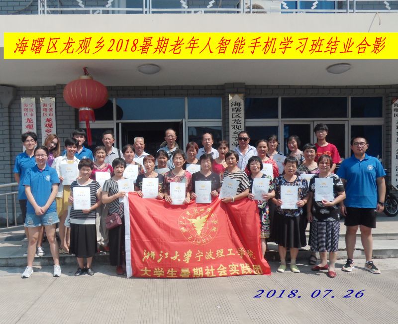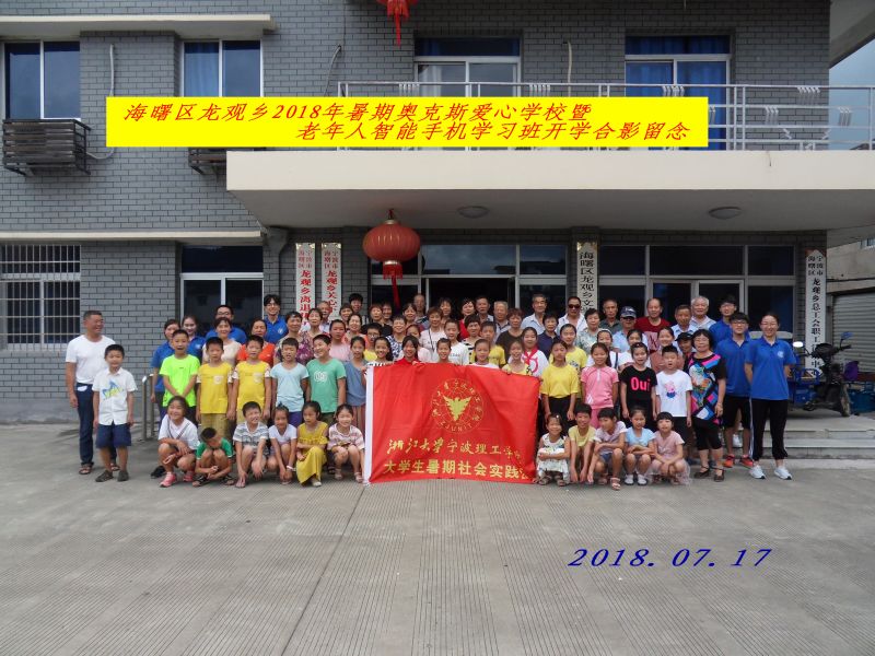 太阳集团tyc4633“机忆龙观,为爱远航”暑期社会实践团于2018年7月在宁波市海曙区龙观乡展开了为期十天的爱心支教活动,今年也是该团队在龙观乡支教的第六个年头。本次社会实践秉持“在创新中传承,在传承中创新”的理念将支教活动分为“奥克斯爱心公司”和“老年人智能手机学习班”两部分。“奥克斯爱心公司”是对三到六年级的小员工进行作文、数学、英语、手工、音乐、舞蹈以及跆拳道等暑期夏令营教学。“老年人智能手机学习班”则是队员们教老年人们如何在朋友圈发表评论、点赞,使用百度和利用手机地图等。