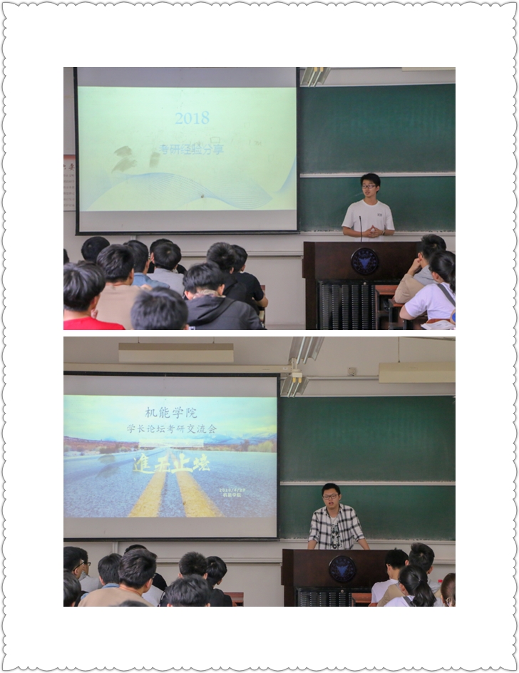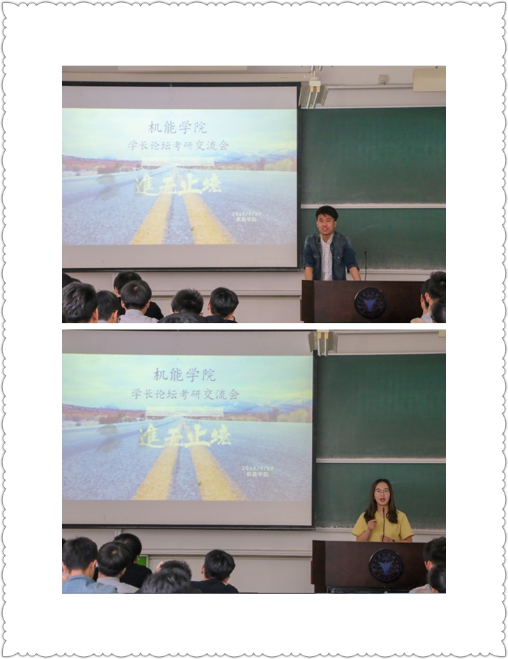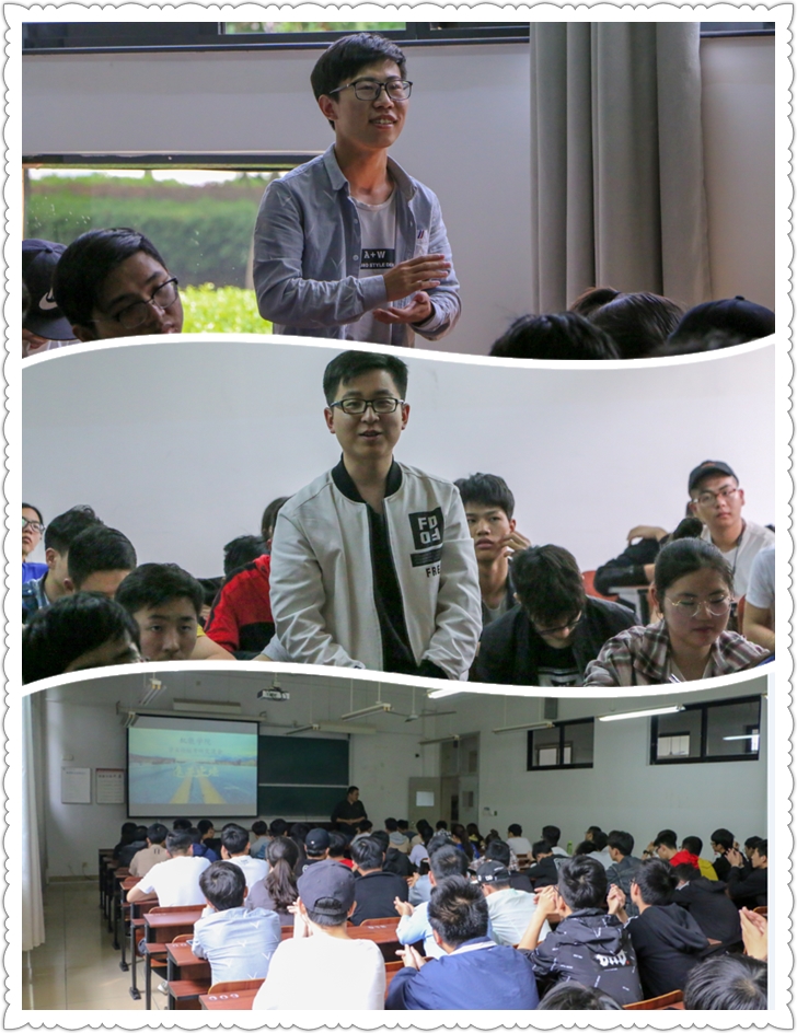 首先,学长们依次在台上讲述了自己这一年来的复习历程,分享了各自的考研经验。曾伟迪通过PPT详细介绍了各科地复习方法、时间安排、做题技巧,并推荐了对应的参考书。金智康分享了自己在浙江大学复试时的经历,阐述了名校研究生复试竞争的激烈性,呼吁学弟学妹们要根据自己的掌握情况,要确定合适的目标公司,特别是第一志愿的选择尤为重要。同时,也希望学弟学妹们在校期间能多参与学科竞赛,拓宽专业视野,对今后参加研究生复试有帮助。刘庭崧分享了自己的考研原因、如何克服消极心态等。蒋夏莹分享了把考研大目标分解成各个阶段小目标,逐一完成;要加强身体锻炼,注重劳逸结合,提高复习效率。