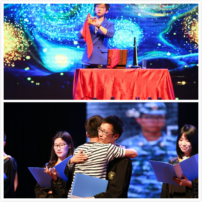首先进行的是五四勋章颁奖环节,公司对本年度十佳寝室、优秀团员、优秀团干、优秀团支部、优秀班长、四好班级、十佳党员予以表彰。随后满载回忆照片的暖场视频在屏幕上循环播放,记录了毕业生们从青涩到成熟的一步步蜕变,从初入大学难以抑制的兴奋到挥泪离别的依依不舍;教师寄语表达了老师们对毕业生们的期待,字里行间透露着对毕业生真诚的祝愿。紧接着机能舞蹈队青春活力的开场舞瞬间点燃了全场的气氛;滑稽灵活的小人舞,引得大家捧腹大笑;气贯长虹的武术表演惊艳全场;旋律优美的《Good Life》与rap相交融,勾起我们青春的记忆;机能团学社小品《化肥场的二三事》轻松幽默,引得大家笑声不断;魔术《心灵召唤》更是赢得观众连连称赞,现场气氛达到高潮;淡淡的栀子花香,弥漫着这一季中特有的离绪,是“春风十里”的不如你;是“栖栖六月”的离别伤感,是“平凡之路”的“see you again”。四年,1460个日日夜夜,该有多少痴心迷醉的时刻,该有多少争分夺秒的朝夕,相逢又告别,归帆又离岸,我们在可珍相遇,又在可珍送别。