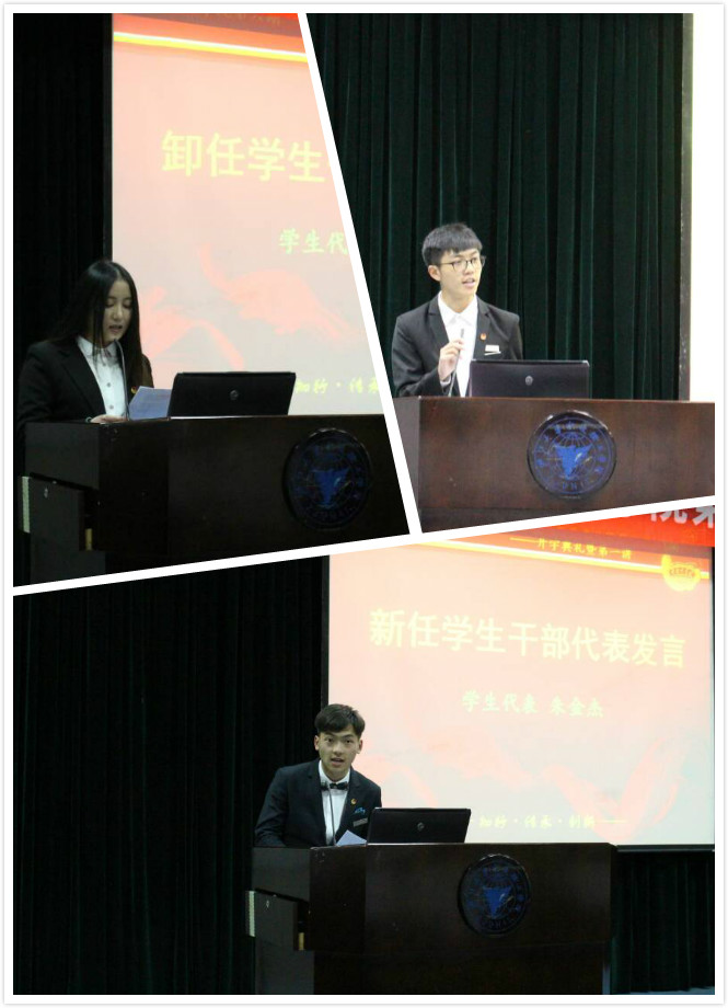 而后,团委书记助理李一波作为员工代表,以“德”字为先、“干”字当前、“优”字为重三方面做出承诺。上一届团委书记助理袁露代表卸任员工干部发言,她回顾了担任员工干部期间的师生情、同学义、人生梦,告诫大家正确定位员工干部的位置,践行为广大师生服务的意识。新任员工会主席朱金杰,以诙谐幽默的演讲分享了自己的工作经验,并对未来进行展望。