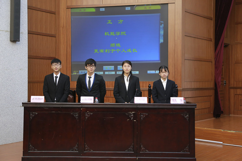 在主持人简短介绍后,比赛立即进入开篇立论环节。首先,一辩潘佳咪同学围绕“顺境更有利于个人成长”这一观点展开细致阐述,而反方以同样严密的论述回击。随后的攻辩中,二辩程旭晖以处变不惊的态度和严谨的逻辑步步紧逼,进一步阐述己方观点,犀利直击对方漏洞。而三辩陈能,即使带病上场,依旧从容不迫、妙语连珠,在提问环节中,以犀利的言辞直击对方要害,使反方暴露出更多漏洞,为己方夺得更多机会。而后,在最精彩的自由辩论环节,双方辩手皆表现得相当机敏与睿智,两方来回周旋,场面异常激烈。机能辩手坚定立场,旁征博引,辩口利辞,迅速掌控场上主动权。最后双方四辩分别对本次辩论进行总结,张雷引经据典,力证己方观点,缜密的思维赢得现场观众一片叫好。
