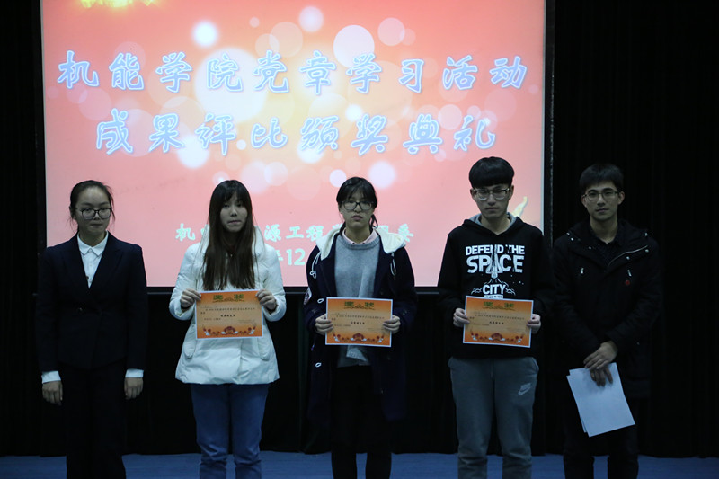 各支部制作的手抄报由嘉宾进行现场评分,荧幕上滚动播放一幅幅手抄报图片,“长征胜利80周年”字样的反复出现一遍遍的向我们宣扬着长征精神。各支部活动照片集成视频的播放,使大家再一次回忆起党章学习活动中的点点滴滴。本次评比共评出一二三等若干名,其中机制164和包装151两个团支部在各个环节中脱颖而出,获得本次党章学习及团日活动评比的一等奖;同时有有五位团支书获得优秀团支书的荣誉称号;五个班级的手抄报被评为优秀手抄报。活动在大家热烈的掌声中落幕。