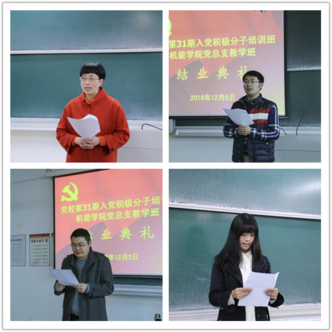 随着激昂的国歌声响起,结业典礼正式拉开序幕。首先由胡鹿鸣老师宣读本次培训班结业学员和优秀学员名单,并由吴春书记为党校优秀学员颁奖。接下来,机制163班杨念同学作为党校优秀学员代表发言,凭借一句“组织上入党一生一次,思想上入党一生一世”概括了培训期间的所感所悟。