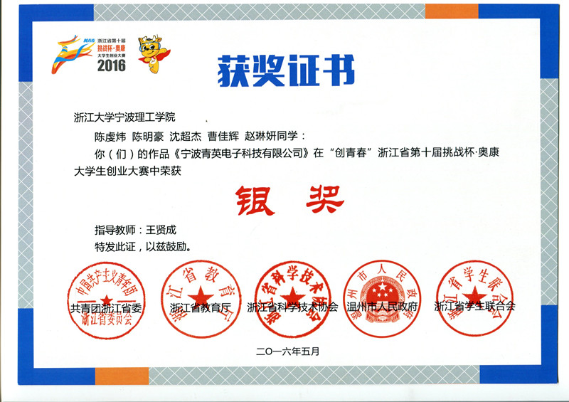 2016年5月22日,浙江省第十届“挑战杯·奥康”老员工创业大赛在温州医科大学落下帷幕。太阳集团tyc4633《宁波青英电子科技股份有限公司》项目荣获本届挑战杯创业实践类银奖,为全校历年来在创业实践类竞赛中取得的最好成绩。
