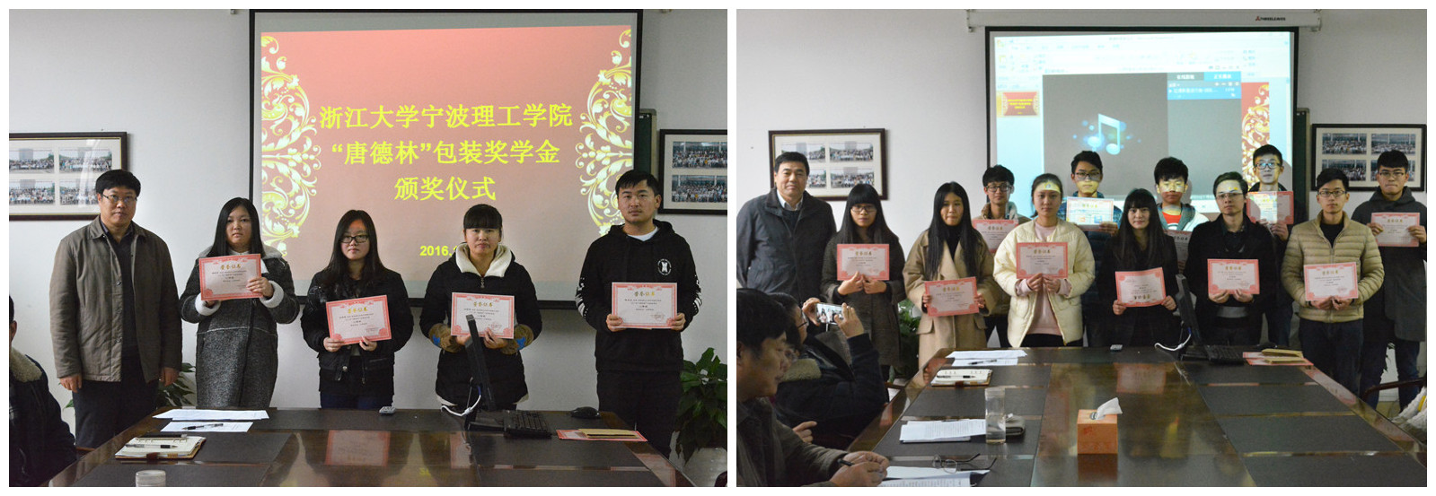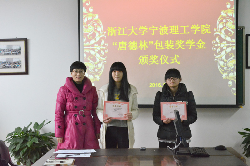 2016年1月8日下午,太阳集团tyc4633于NA408会议室举行浙江大学宁波理工公司2015年“唐德林”包装奖学金颁奖典礼。公司党总支书记吴春老师、副经理高德、王义强教授以及公司学工办主管胡鹿鸣老师受邀出席。颁奖典礼由公司团委书记仇芳老师主持。