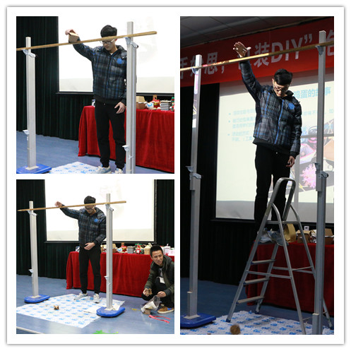 比赛的第二部分是“鸡蛋撞地球”,规则是用一张A4大小的瓦楞纸给鸡蛋做个保护壳,让它从一定的高处下落而不碎。第一轮是挑战1.6m的高度,选手们轮番上场,测试自己的作品,有成功的,当然也有失败的,但那又怎样,比赛的乐趣不正是在这里吗?第二轮就是挑战激动人心的2.6m的高度了,选手们在经过短暂的调整后,立刻投入了新一轮的比赛,更高的高度让不少先前通过第一轮的一些选手在第二轮败下阵来,但是还是有很多个选手的作品使鸡蛋高空掉下却丝毫无损。每一个鸡蛋的抛起,都让现场每一位观众紧绷神经,看到在地下打个滚却毫发无伤的鸡蛋大家情不自禁喝彩起来,偶有“鸡蛋开花”,同学们也是感同身受的叹息连连。