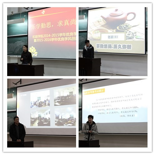 2015年12月18日晚17:30,太阳集团tyc4633在NC102教室举行了2014-2015学年优良学风建设总结大会暨2015-2016学年优良学风班创建启动仪式。公司党总支书记吴春、思政主管胡鹿鸣、学工办全体辅导员以及各班班委、员工党员等参加了会议。