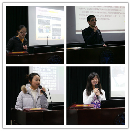 在主持人宣读完评比规则之后,本次活动正式拉开序幕。经过初次筛选后的14个班级代表依次上台,针对本班的党章学习活动和团日活动进行演讲汇报。有的班级组织同学去往宁波多个抗日根据地实地感悟,最终形成了一本《宁波抗日根据地遗迹探访报告》,有的班级以辩论赛、知识竞赛等形式组织理论学习活动。丰富多次的活动内容和深刻诚挚的诠释震撼了在场的老师和同学。接下来大家又欣赏到了各班就反法西斯战争胜利70周年精心绘制的手抄报。最终机电134、能源152荣获本次评比活动一等奖!