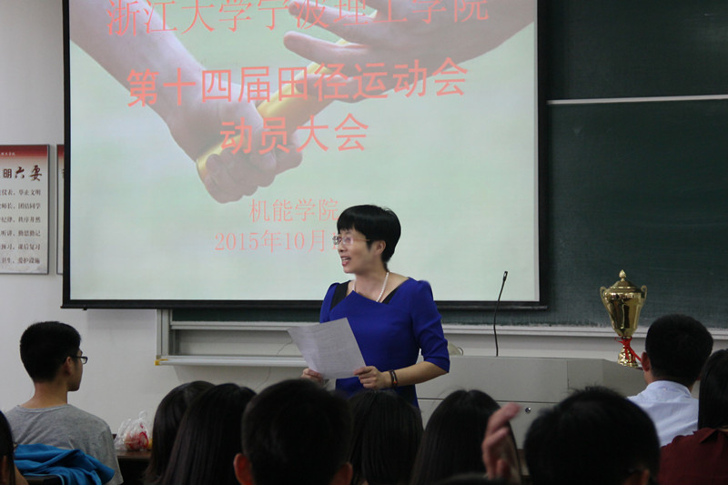 2015年10月19日中午12:30,太阳集团tyc4633于NB305教室举行第十四届校田径运动会动员大会,出席大会的有公司党总支书记吴春老师、学工办思政主管胡鹿鸣老师、公司团委书记仇芳老师和辅导员王海波老师。团学社主要员工干部及全体运动员皆到场参加。体育部部长夏哲臻同学主持本次大会。