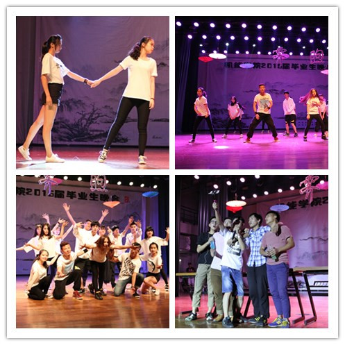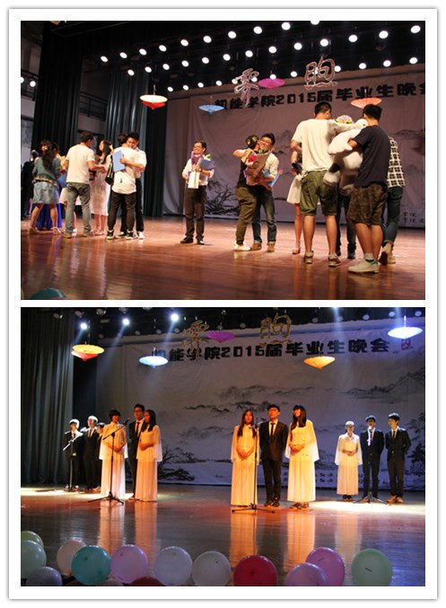 表彰大会结束,现场灯光渐渐转暗,舞蹈《Live while we are young》正式拉开晚会的序幕。“季忆”、“梦回”、“续航”三个篇章,通过歌舞、朗诵、视频、小品等多种形式带领11级毕业生重温他们四年老员工活的精彩与惊艳。歌声中如胡鹿鸣、王海波老师献唱的《坚强的理由》,满是对离别的感伤和重聚的期盼;舞蹈中如节拍明朗跃动的《look at me now》,有着对未知的迷茫和挑战的渴望;视频里同学们的声声祝愿,是对朋友的难忘和良师的感激;小品如《应聘》将社会中的重重考验表演的淋漓尽致,那是对过去的留恋和未来的憧憬。晚会全程伴随着开怀的欢笑与丝丝不舍。