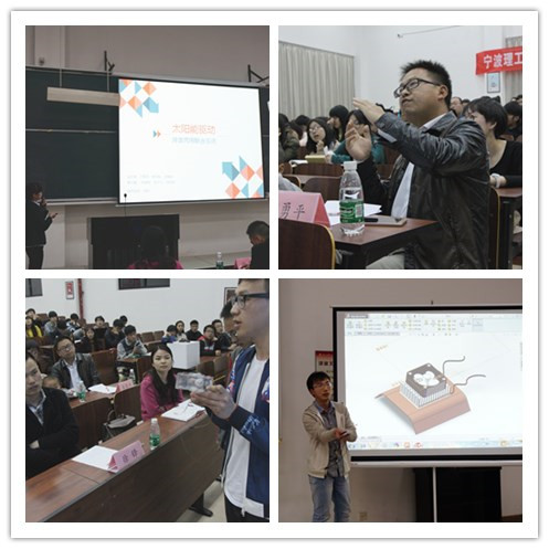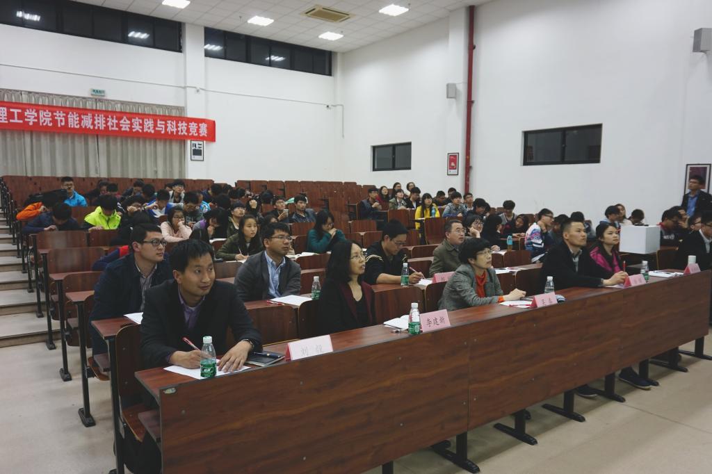 比赛开始后,每队同学依次在五分钟内对自己的设计进行介绍,并完成答辩。第一队的“压感流量控制装置” 关于排泄量的测量功能令人捧腹大笑,紧接着介绍的“空气过滤系统设计”,“蹦蹦+”,“夜间可亮式篮球场”使大家对此产生热烈的讨论,“家庭-小区二次用水系统”以及“太阳能系统跨界两用能源系统”又进入了一个充满专业术语的领域。“ice watch”中运用多方面知识使节能减排产生新的火花。“关于沿海城市建筑布局及风能利用的调查”和“管道铺设设计及利用浴室用水”也体现了参赛选手在平时生活中细心观察的好习惯。