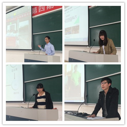 接着四个实践团的代表上台演示。分别是汪严超代表的“绿意生态、本土旅游”团队,毛江淳代表的“挥洒青春,回报社会”团队,毛敏代表的“走访老员工村官”团队,汪力代表的“宁波龙观乡留守儿童支教活动”团队。