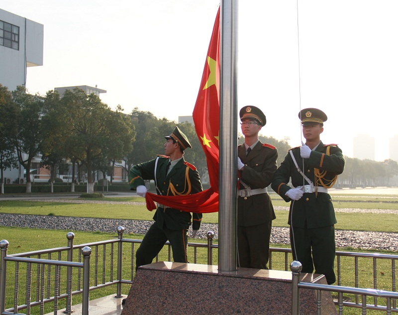 清晨的微风中,英姿飒爽的国旗护卫队队员们护送鲜艳的五星红旗进场,礼毕,伴随着庄严的《中华民族共和国国歌》,五星红旗冉冉升起。在场的每一个人向国旗行注目礼,深怀对祖国的无限热爱和崇高的敬意。