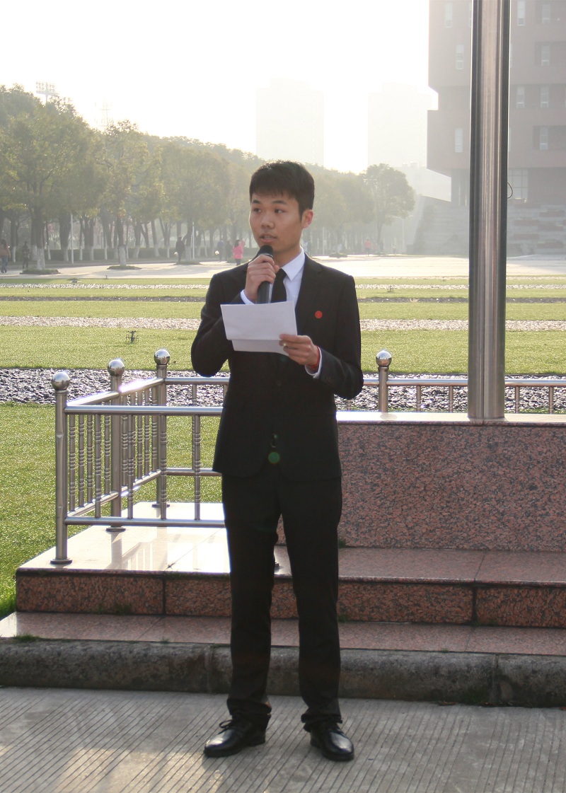 升旗完毕,来自机电121班的现任员工会主席高正杰同学就“如何成为一名合格的员工干部”作了国旗下发言。发言中谈到,合格的员工干部首先要在思想上武装自己,在组织上积极向党靠拢。他呼吁大家,吃苦在前,享受在后,全心全意为同学们服务。他同时指出,当代老员工最需要的三个技能:会说,会写,会做。他也站在学长和主席的角度希望新一轮团学社在继承并发扬前团学社优良传统的同时,在新的形势下搭建新的舞台。