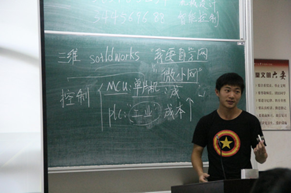 随后陈明豪学长向同学们介绍了他整个大学参与学科竞赛、科研项目的情况,激励学弟学妹们努力学习,他鼓励大家说:“现在我给你们创造了一个平台供你们学习探讨,有难题可以来找我,我尽自己所能来帮助你们。”他的发言得到了同学们热烈的掌声。同时,陈明豪学长还介绍了如何学习好专业知识,向同学们推荐了一个三维软件和自学网站“我要自学网”,并提及了许多以后将要学习的单片机知识。