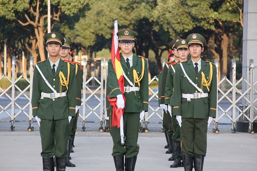 早上6时40分,英姿飒爽的国旗护卫队队员们护送鲜艳的五星红旗进场,伴随着庄严的国歌,五星红旗冉冉升旗,迎风飘扬。在场的每一个人深怀对祖国的无限热爱和崇高的敬意唱响中华人民共和国国歌。