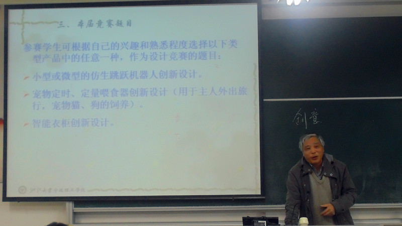 我们邀请到黄方平、沈萌红等资深教授为同学们做详细讲解。他们讲解了设计比赛的详细情况。其中包括比赛作品的主题、参赛人数、创新设计比赛的发展以及在这些比赛中参加过选手取得的骄人成绩。使同学们对于参赛的注意事项及参赛流程有了深入的了解。随后,他们深入浅出的分析了作品的制作技巧,赢得同学们的热烈掌声。