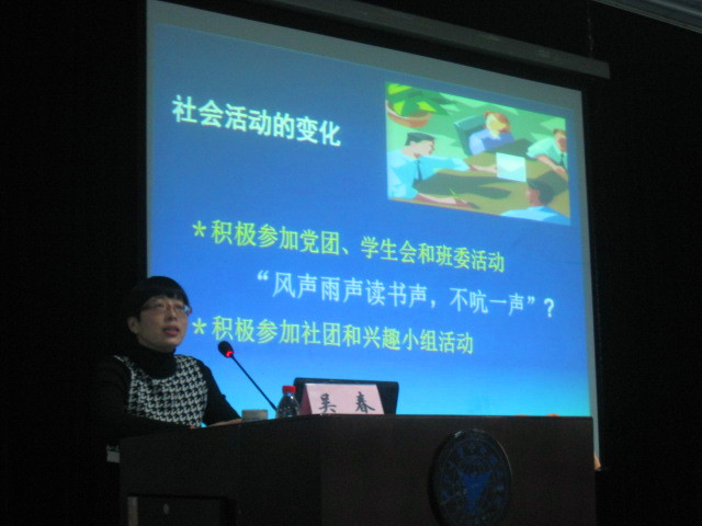 吴春老师首先向大家介绍了安排本次讲座的目的和背景。接着,她列举大量数据和案例,从如何适应老员工活、如何做好人生发展规划、如何做人做事做学问、如何做一个优雅的人、如何处理好大学情感问题等五个方面为大家进行详细介绍。她希望大一新生在老员工活中永远不要放弃对梦想的追求,学会对学习怀有崇敬之心,努力做一个对国家和对社会有用的人。最后,吴春书记寄语全体新同学通过自己的努力,都能拥有一个美好的明天。