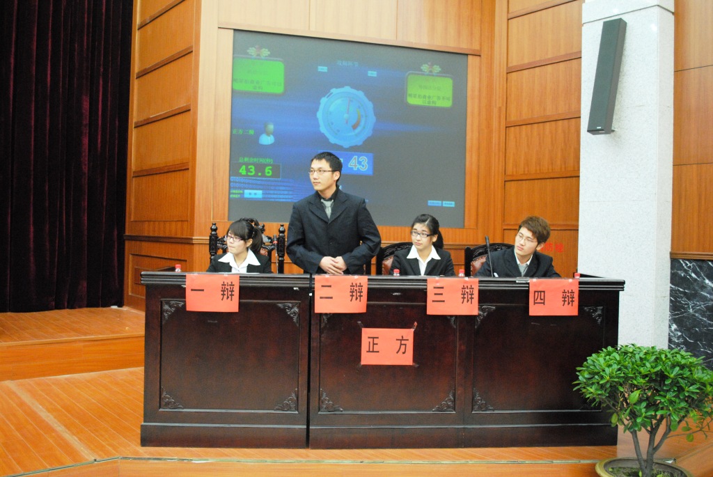 3月23日晚,公司第九届学术科技节之“辩话无穷”——2011年“求是杯”辩论赛,第一轮第三场在模拟法庭举行。此次辩论赛由机电分院辩论队对抗外语分院辩论队。场上双方辩手围绕“明星拍商业广告可不可以虚构”展开了激烈的争辩,我方作为正方观点是可以虚构,辩论队成员是一辩包装092班方芸芸、二辩能源081班严驰、三辩能源101班赵中辉、四辩包装101班单佳莹。辩论队指导老师刘炳辉观摩了整场辩论。