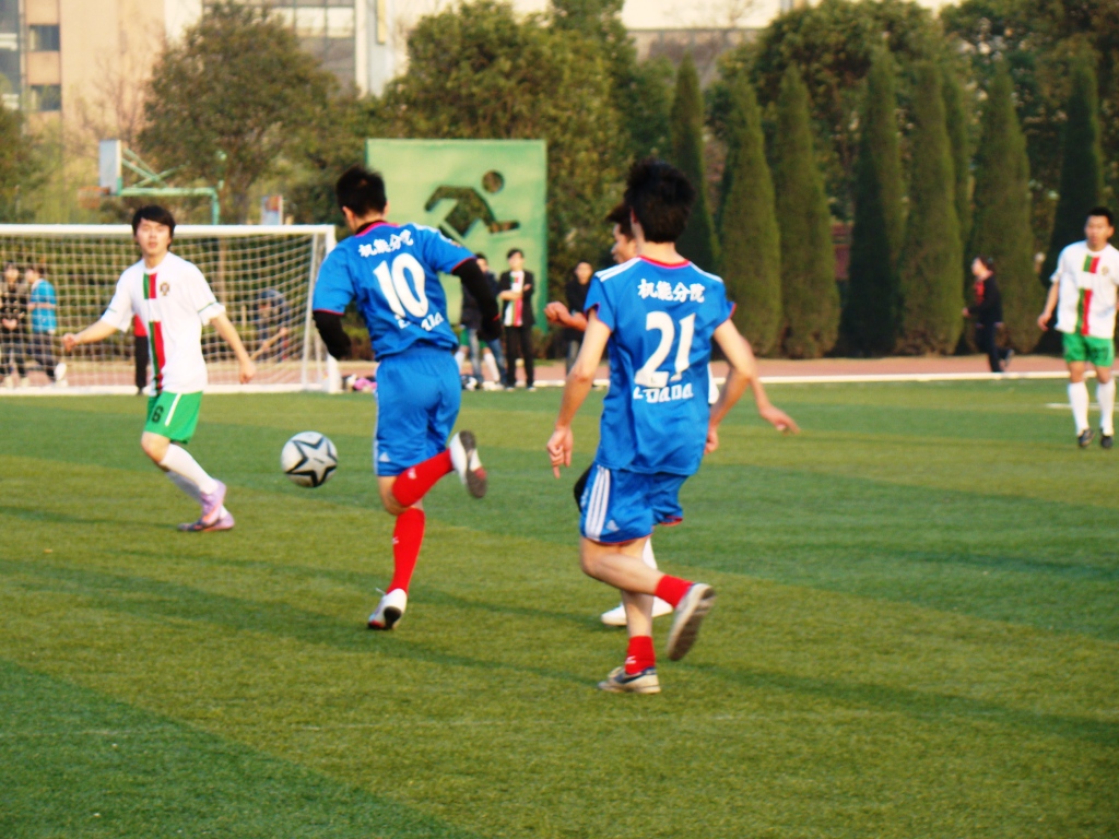 裁判员的一声哨令,足球赛便拉开了帷幕。比赛一开始便进入了白热化的状态,双方实力相当,互不示弱。黑白色的足球像欢快的精灵游离在球员们的脚边,在他们的身肩擦过,又在他们的头顶呈抛物线抛出,眼看管理分院球员带球跃进我方球门附近,我们的主力队员一个漂亮的头球解除危机,双方队员都具有相当的实力。在上半场过程中,双方都展开了猛烈的攻势。这时机能分院一个点球打破僵局,场上顿时沸腾起来。虽然没有得分,但是队员们没有放弃,依旧奋力地抢球。