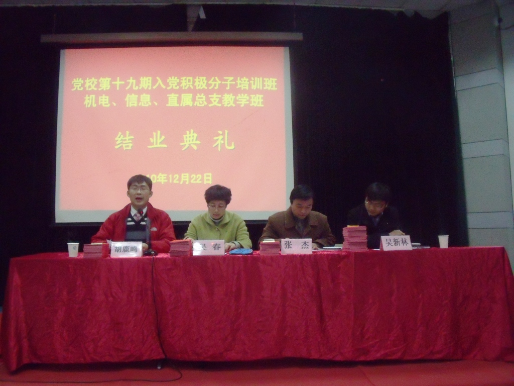 12月22日下午,公司党校第19期入党积极分子培训班机电、信息、直属总支教学班结业典礼在NF103举行。信息分公司党总支副书记张杰、机电分公司党总支副书记吴春、信息分院思政主管吴新林以及各党校班主任、所有学员参加了此次结业典礼。会议由机电分院思政主管胡鹿鸣主持。