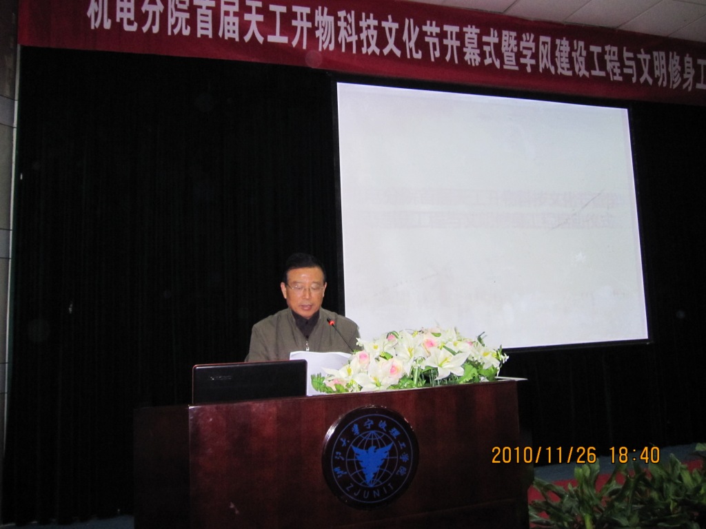 11月26日晚6:30分,在NF103教室隆重举行了机电分院首届天工开物科技文化节开幕式暨学风建设工程与文明修身工程启动仪式。分院经理王龙山,党总支副书记吴春,副经理李建新,辅导员老师胡鹿鸣,付浩,吴琼,刘炳辉及周丹丹出席了本次活动。