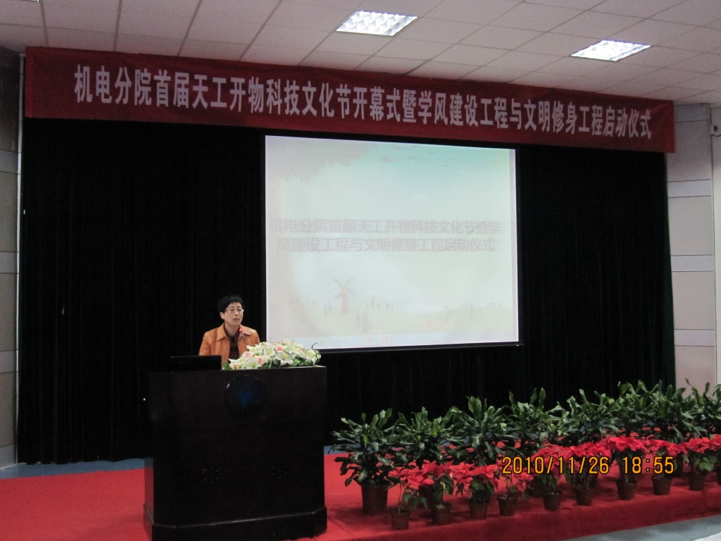 接着,由吴春副书记上台宣布首届天工开物科技文化节暨学风建设工程与文明修身工程启动仪式开幕并作简短讲话。她以感恩机能,科技机能,务实机能为主题分别对前段时间的学风建设工作做了总结评论并对之后的建设要求进行了展望。同时强调了员工在专业学习与理论实践结合方面的重要性所在,还列举一系列活动对其进行了丰富拓展。并将"优良学风人人共建,学风优良人人共享”16个大字了送给每位机能学子,传递了她的祝福与心愿。