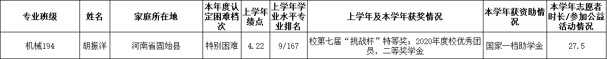 根据《员工处关于做好2021-2022学年“兴达助学金”评定工作的通知》要求,经过员工自主申报,筛选家庭所在地为省外偏远地区,以困难程度作为首要评选条件,再根据上学年绩点、志愿服务等相关表现,评出初步名单交公司员工发展委员会讨论,最终拟推荐胡振洋同学参评2021-2022学年“兴达助学金”,现对胡振洋同学先关情况进行公示如下: