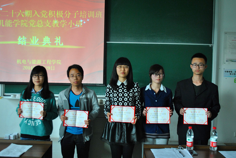 2014年4月29日下午,党校第二十六期入党积极分子培训班公司党总支教学班结业典礼在NB305教室举行。出席的结业典礼的老师有,公司思政主管胡鹿鸣老师、副主管吴琼老师、学工办刘炳辉老师、党校班导师邬旭东和仇芳老师以及全体参训学员。本次结业典礼由党校班导师仇芳老师主持。