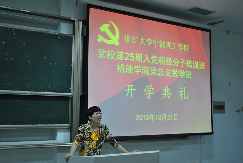 2013年10月21日晚,浙江大学宁波理工公司党校第25期入党积极分子培训班公司党总支教学班开学典礼在SF106顺利举行。公司党总支书记吴春老师、思政主管胡鹿鸣老师、副主管吴琼老师、党校班导师仇芳老师、全体参训学员出席了典礼。典礼由邬旭东老师主持。