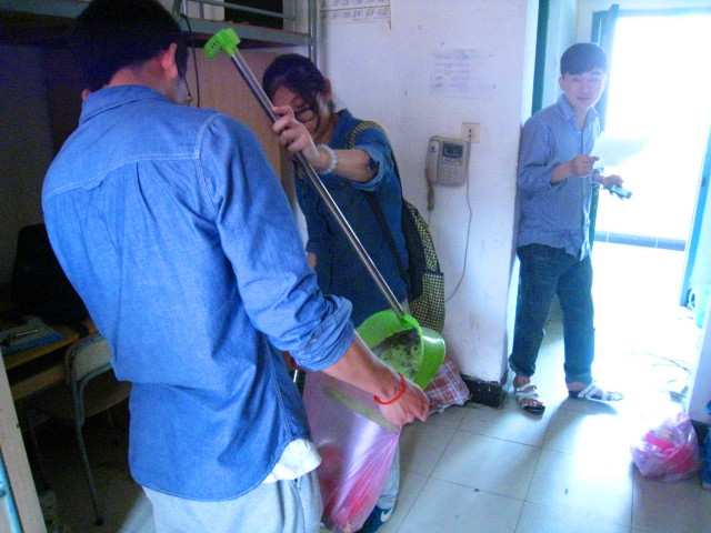 本次入党积极分子培训班实践课程内容为服务毕业班整改寝室卫生,主要在23幢的机能大四员工寝室以及24幢的走廊进行卫生清理。在23幢一楼,许多寝室的大四学长们都很愕然于积极分子们的到来,但很快,寝室的学长们都积极配合起了卫生清理工作。不一会儿,寝室里一片热火朝天。