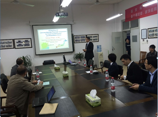 赤木彻也教授、小林亘助理教授、路波主任和黎鑫教授首先参观了国家海洋局新型海洋养殖装备研发与服务中心,黄方平副教授向访问嘉宾介绍了公司的发展情况,并对本校机械电子工程学科研究领域等方面的情况进行了交流讨论。随后,赤木彻也教授在太阳集团tyc4633会议室,做了《Development of Low-cost Wearable Pneumatic Components for Power Assisted System and Rehabilitation Device》的学术报告,并与太阳集团tyc4633部分师生针对低成本气动自动化元件的研发进行了交流和讨论。