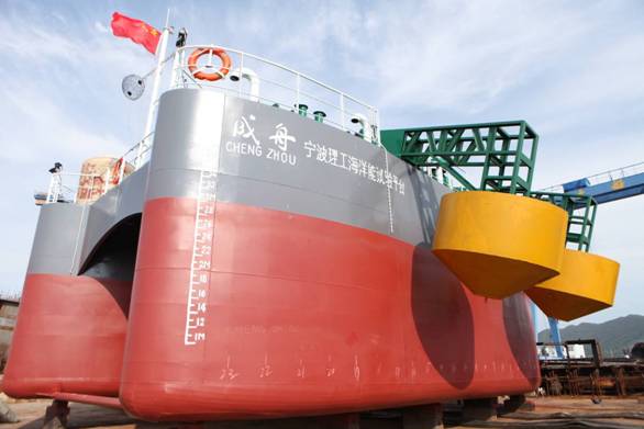 该实验平台总长14米,宽度11米,高度4.5米,为漂浮式双体船式平台,中间放置水平轴式潮流能捕获装置,两侧放置波浪能捕获装置,同时还安装有波浪能、潮流能耦合的发电制淡液压系统、控制系统等。该平台的成功研制为项目的顺利完成以及国家新型海洋养殖装备研发与服务中心的建设打下了坚实的基础。